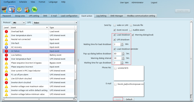 3. 轉到事件動作頁面,然后選擇協(xié)議,UPS和事件,如圖3-1所示。例如,選擇“交流故障”事件,然后選擇發(fā)送類型,選擇負載關機、UPS關機、輸入負載關機等待時間、負載關機提醒、關機前彈出的對話框、警告對話間隔、UPS關機等待時間,然后點擊“應用”按鈕,參見圖3-2。